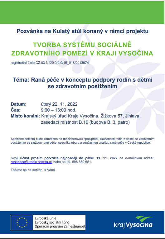 Raná péče v konceptu podpory rodin s dětmi se zdravotním postižením - setkání odborníků z resortu školství, zdravotnictví, práce a sociálních věcí i zástupců státní správy zaměřené na mezioborovou spolupráci, sdílení zkušeností rodin, představení specifik oboru i současné analýzy rané péče v ČR.